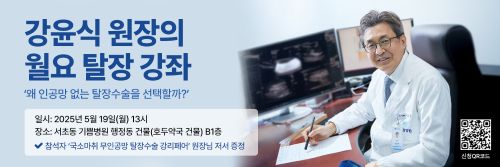 혁신적인 '강리페어 수술'을 개발하여 의료계에 새로운 지평을 연 기쁨병원의 강윤식 병원장님을 모시고 월요 탈장 강좌를 개최하게 되었습니다. 이번 강연은 의학 전문가뿐만 아니라 건강에 관심 있는 모든 분들께 열린 건강 강좌입니다.   강연에 참석하시는 분들께는 기쁨병원에서 준비한 강윤식 병원장님의 저서 '국소마취 무인공망 탈장수술 강리페어'를 선착순으로 증정해 드립니다.       장소 : 기쁨병원 옆 호두약국 건물 지하 1층 일시 : 월요일 12시 30분 ※ 국경일이나 해외 출장 등 특별한 사정이 없는 한, 매주 월요일 개최될 예정입니다. |