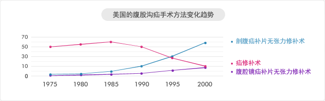 观察比韩国早10多年专门疝气中心已成为活性化的美国疝气手术变化趋势,剖腹疝补片无张力修补术人次1990年起十年之间增加到6倍,成长为疝气手术的主流,相反腹腔镜疝补片无张力修补术的增加势。速度缓慢。这认为是因为腹腔镜疝补片无张力修补术熟练为止需要时间较长,损伤周围脏器和血管的危险性也较高,还在手术费用和复发率、麻醉等方面比剖腹疝补片无张力修补术效果不佳的结果。我们欣喜医院因诸多理由虽有最新腹腔镜设备及腹腔镜手术队伍,但只施行剖腹疝补片无张力修补术之一种疝环充填式无张力修补术(Gilbert,mesh plug & Patch)。